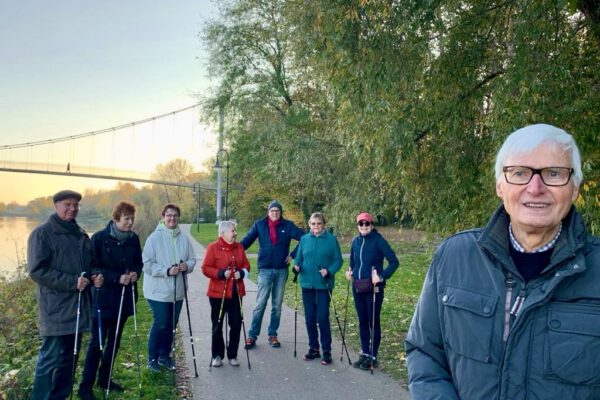Wir haben eine „Igel“- und eine „Hase“-Gruppe. Beide walken mit Stöcken und ohne Stöcke. Bei den „Igeln“ geht es gemächlicher voran – gerne auch mit Rollator.